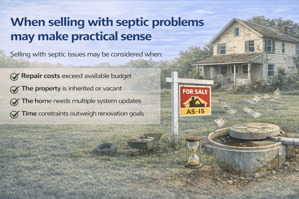 Traditional buyers often rely on mortgage financing, which may involve stricter inspection and lending requirements. Septic system concerns, such as age, failure signs, or incomplete records, can sometimes delay or derail financed transactions.